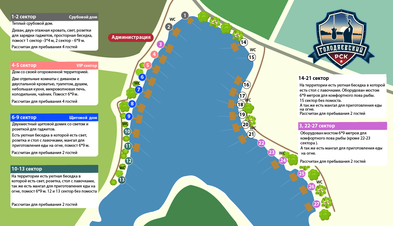 Членство в клубе «ГОЛОДЯЕВСКИЙ КАРП» дает право нахождения на водоеме «РСК ГОЛОДЯЕВСКИЙ» с учетом использования имеющейся инфраструктуры в соответствии с правилами нахождения на водоеме.